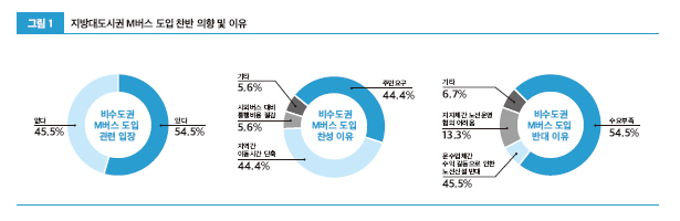 지역별로는 광주권, 대전권 지자체의 M버스 도입 찬성 비율이 70% 이상으로 높았다. 대구권에서는 전반적으로 M버스 도입 찬성 비율이 낮았다. 또한, 기초지자체는 M버스 도입 찬성 비율이 높지만, 광역지자체 대부분은 M버스 도입에 반대했다. 주요 찬성 이유는 주민의 요구와 지역 간 이동시간 단축이 각각 44.4%로 가장 높게 나타났다. 도입에 반대한 지자체 대부분(73.3%)은 M버스 수요부족을 주요 반대 이유로 선택하였다. 도입 찬반의 주요 사유는 지역별로 큰 차이가 없었다.