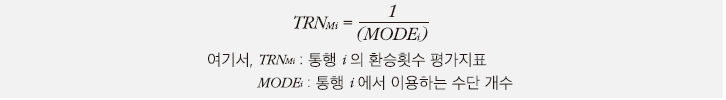 환승횟수 평가 지표는 출발지로부터 최종목적지까지 통행하는 데 여러 가지 대중교통 수단을 연계하면서 환승횟수가 많아지면 이용에 불편성이 높아져 취약하다고 판단하고, 이를 평가할 수 있도록 하였다. 본 지표 또한 값이 작을수록 취약하다고 판단한다.