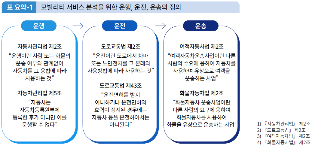 자율주행 기반 모빌리티 서비스의 법적·제도적 분석은 자율주행차의 상용화를 위해 중요한 세 가지 단계인 ‘운행’, ‘운전’, ‘운송’으로 나뉘어 분석하였다. 즉, <표 요약-1>에서 제시한 바와 같다.