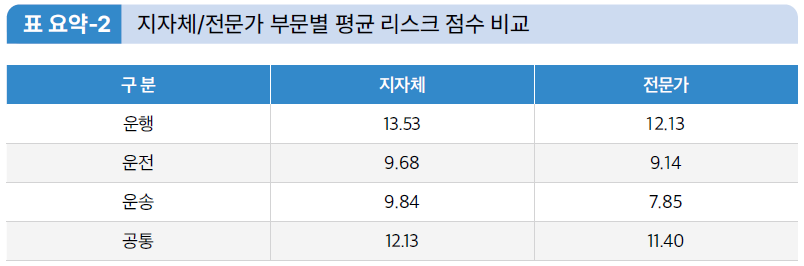 운행, 운전, 운송, 공통 부문에서의 지자체 및 자율주행 전문가 설문결과, 전반적으로 그룹별로 고려되는 법·제도의 심각도, 발생확률에 대한 의견이 상이한 것으로 나타났다. 전반적으로 자율주행차시범운행지구 지자체 담당자의 경우 운행 중심의 법·제도 항목을 중점적으로 고려하고 있는 것으로 나타났다. 그 결과, 상위 순위(1~2순위)의 법·제도 항목들이 대체적으로 운행 부문에 많이 집중되어 있는 경향을 보였다. 반면 자율주행 전문가는 운행, 운전, 운송, 공통 부문에서 지자체 담당자들과 비교했을 때, 항목별 리스크의 평균 점수가 높지 않은 것으로 나타났다. 이에 자율주행 전문가는 실제 자율주행차를 활용한 모빌리티 서비스 제공에 있어서 운행, 운전, 운송, 공통 부문의 전반적인 법·제도를 고려하고 있음을 시사한다.