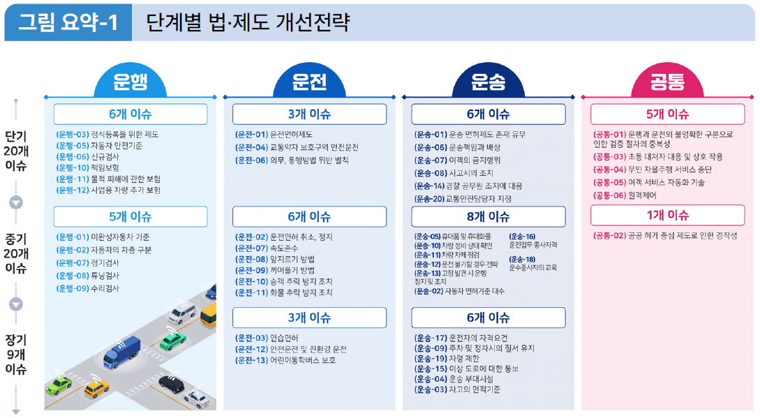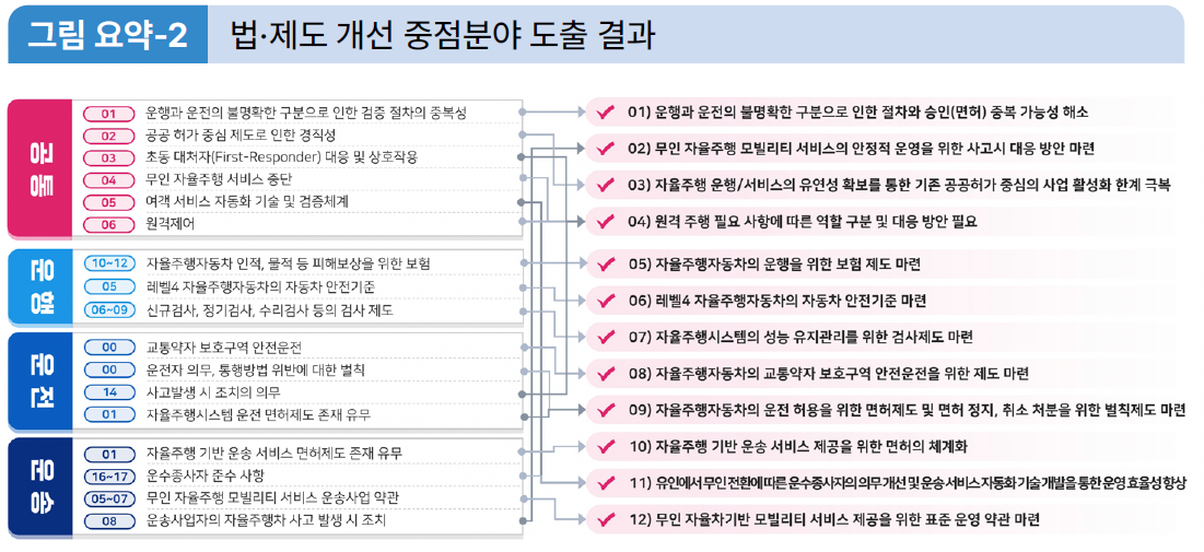 본 연구에서는 앞서 도출한 단기, 중기, 장기의 전략 중 단기에 해당하는 이슈를 12개의 분야로 재분류하여 중점 분야를 도출하였다. 첫 번째, 운행에 관계된 중점분야에는 자율주행자동차에 대한 보험제도, 안전기준, 검사 제도 등의 차량의 정식 등록에 관계된 제도의 마련에 관한 3개의 중점분야를 도출하였다. 두 번째, 운전에 관계된 중점분야에는 무인 자율주행시스템의 도로상에서의 운행 즉 운전을 허용하기 위한 면허제도 마련과 운전 중 법규 위반, 의무 불이행 등으로 인한 면허 정지 및 취소 등의 처분을 위한 벌칙 제도의 마련이다. 또한 어린이보호구역, 노인보호구역과 같은 교통약자 보호구역에서의 안전운전을 위한 제도 마련에 관한 2개의 중점분야를 도출하였다. 세 번째, 운송의 경우 기존 운송사업 면허에 해당하는 자율주행 기반 운송 서비스 제공을 위한 면허의 체계화, 무인 전환에 따른 운수종사자의 의무 개선, 무인 자율주행차 기반 모빌리티 서비스의 표준 운영약관 마련, 무인 자율주행 모빌리티 서비스 운영 중 사고 발생 시 대응 방안 등 3개 중점분야를 도출하였다. 마지막으로 공통 부문의 경우 운행과 운전의 불명확한 구분에 따른 절차의 승인 중복 가능성 해소, 자율주행 운행/서비스 유연성 확보, 원격 주행에 관한 역할 및 대응 방안, 자율주행 기반 여객 서비스 자동화