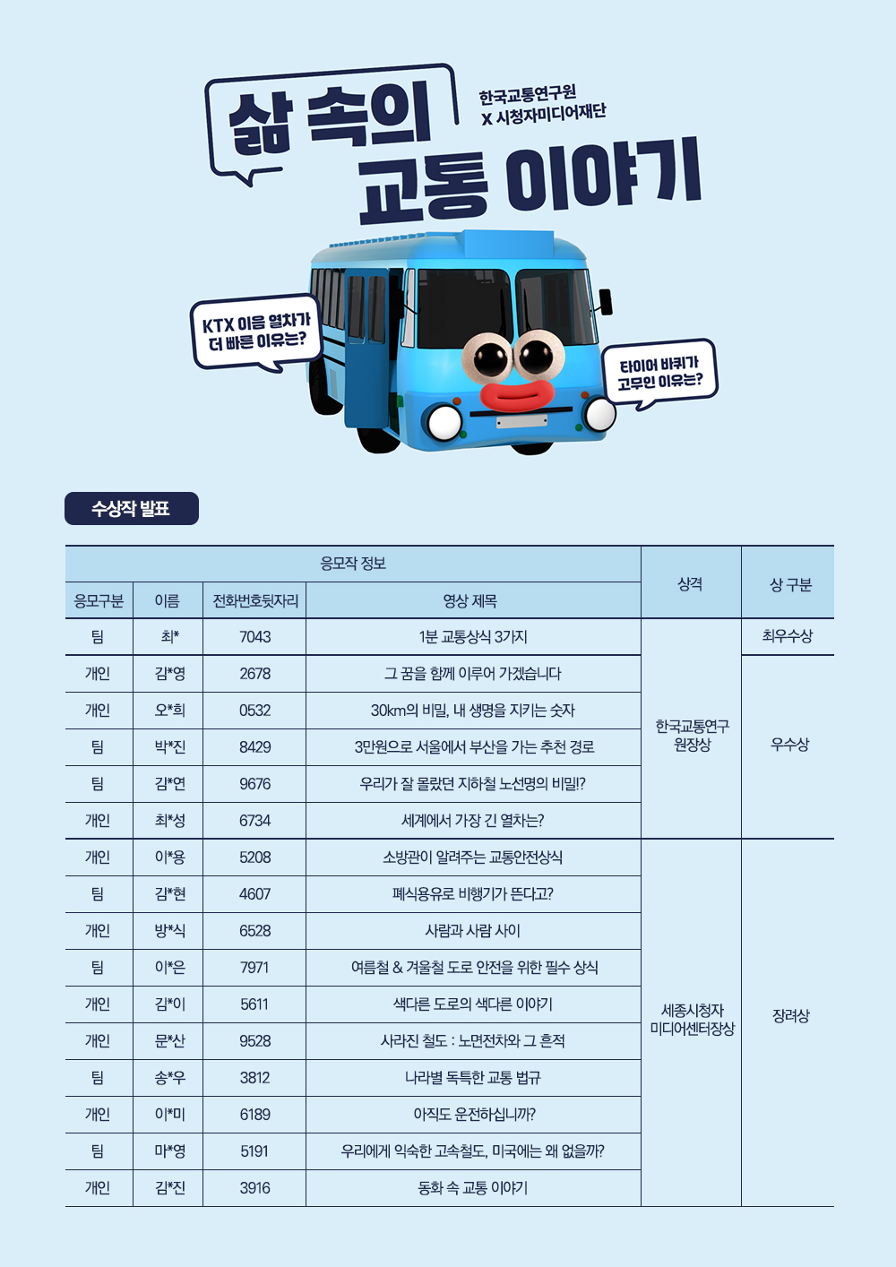 한국교통연구원과 시청자미디어재단 세종시청자미디어센터가 공동주최하는「삶 속의 교통이야기, 숏폼 영상 공모전」수상작을 다음과 같이 공지합니다.